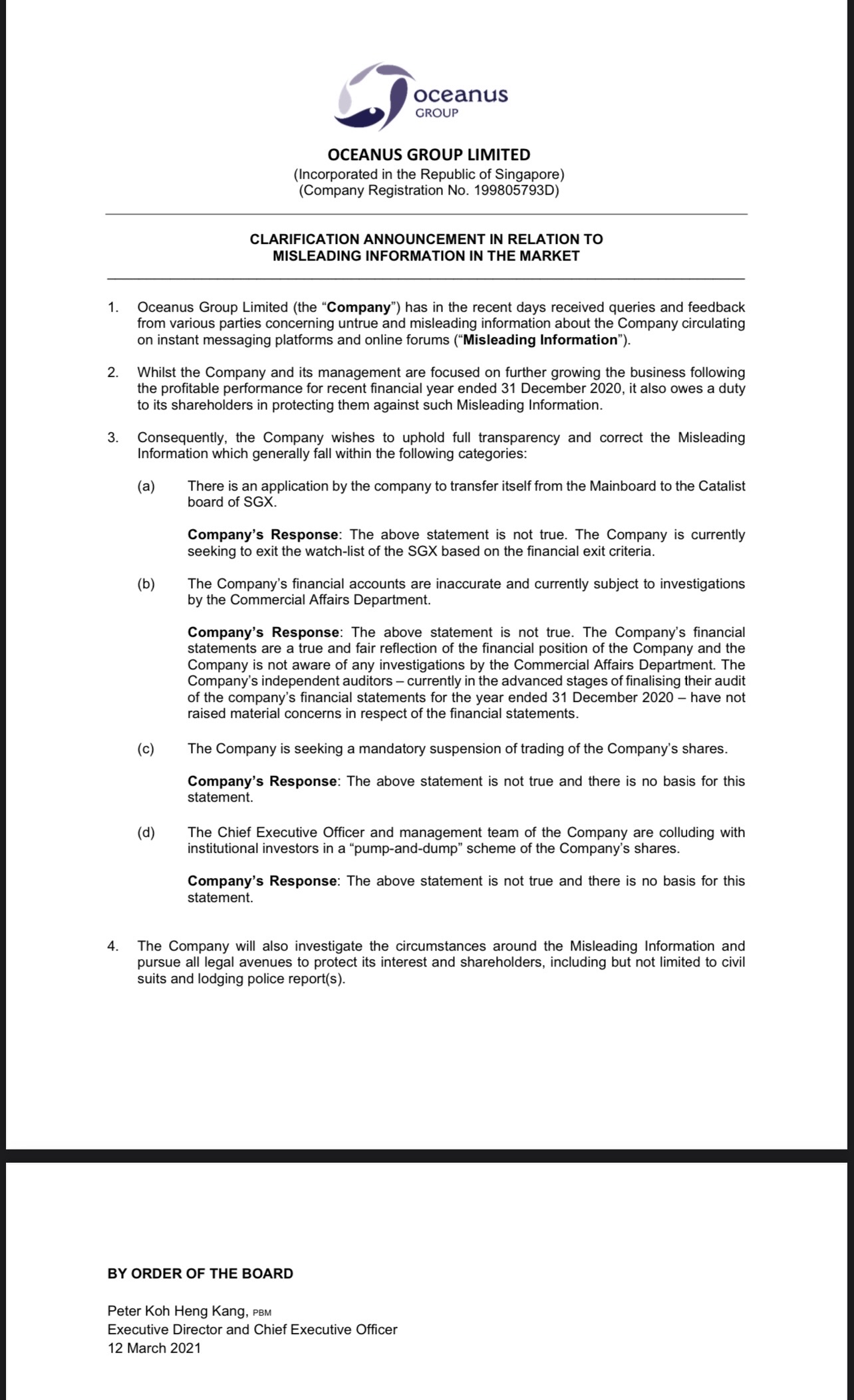 $OCEANUS GROUP LIMITED(579.SI)$Clarification of “fake news” by Oceanus
