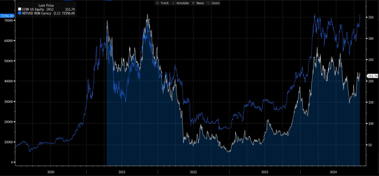 If we compare their trends, both Coinbase and Bitcoin show similar patterns. However, Bitcoin is nearing its all-time high, while Coinbase is still far from its peak.