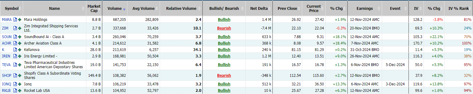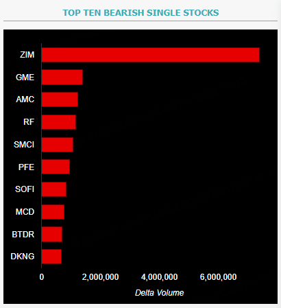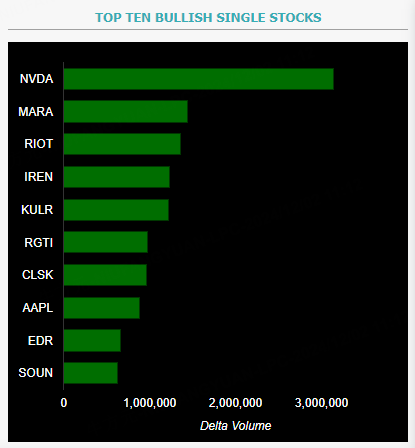 This report shows stocks with the highest volume of bullish and bearish activity by option delta volume, which converts option volume to an equivalent stock volume (bought or sold).