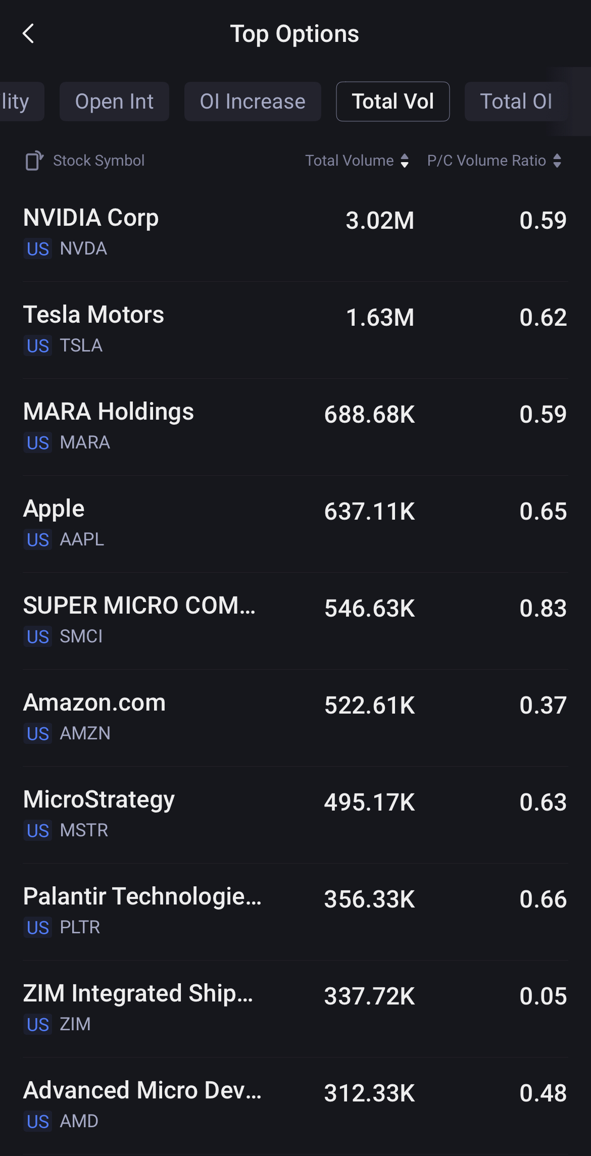 Top 10: $Nvidia(NVDA)$, $Tesla(TSLA)$, $Mara Holdings(MARA)$, $Apple(AAPL)$, $Super Micro Computer(SMCI)$, $Amazon.com(AMZN)$, $MicroStrategy(MSTR)$, $Palantir(PLTR)$, $ZIM Integrated Shipping(ZIM)$, $AMD(AMD)$