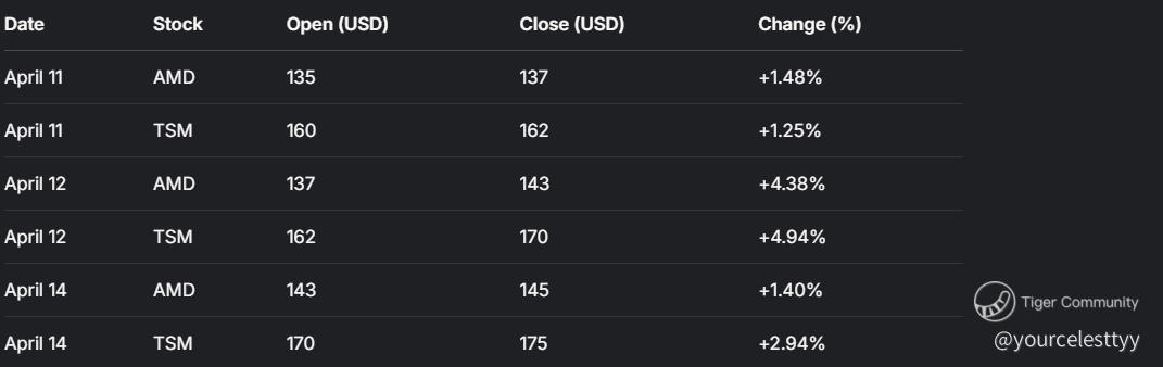 Table: Stock Price Changes for AMD and TSM (April 11-14, 2025)