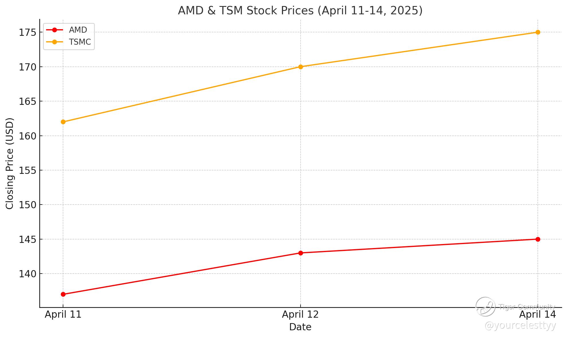 AMD and TSMC stock prices from April 11 to April 14, 2025