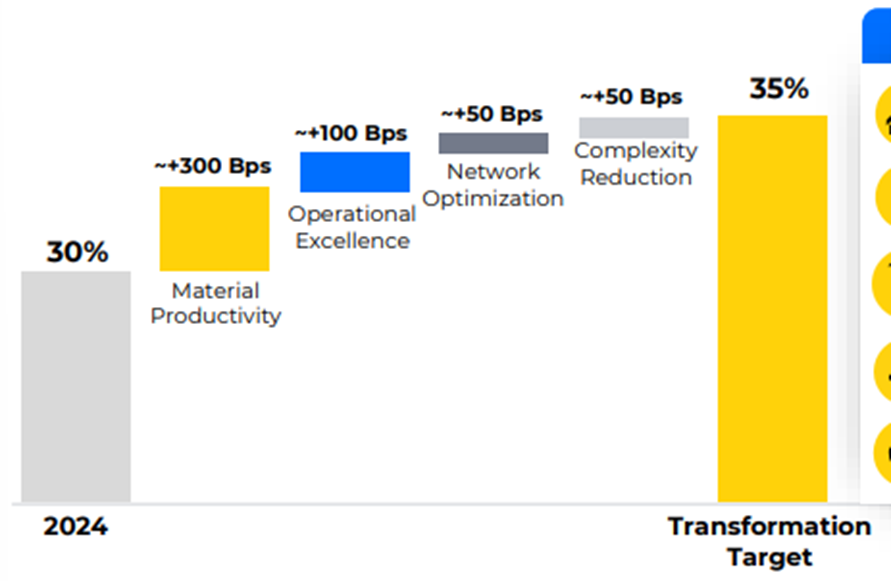 Aggressive transformation, with a long-term target of 35% gross margin (currently 30.2%) and 16% EBITDA margin (currently 9.8%).