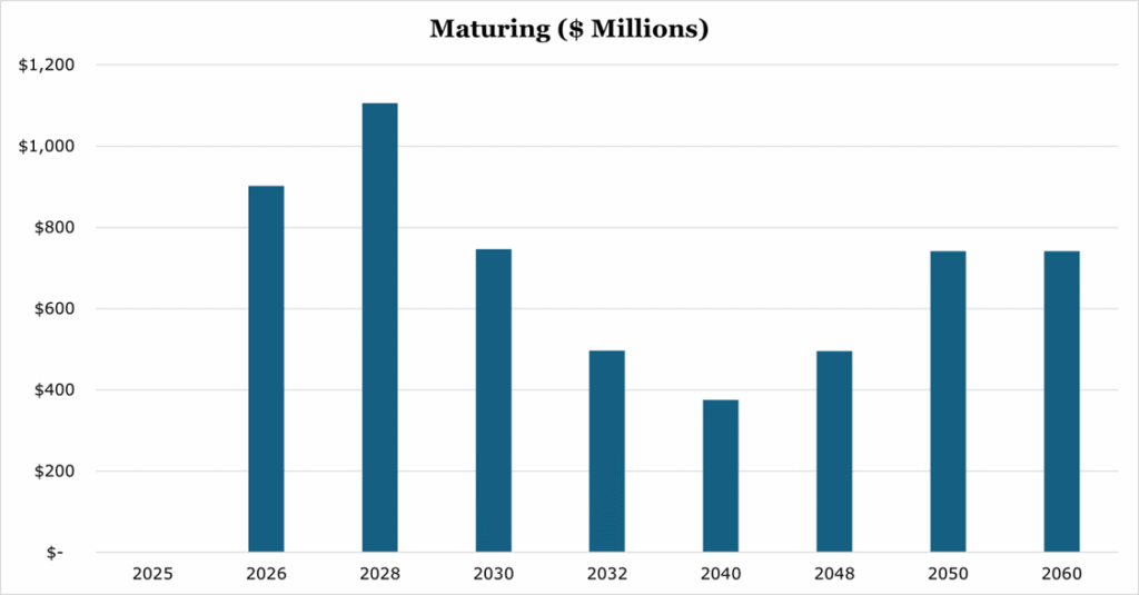 The current debt to EBITDA for the trailing twelve months is 4.4x, with the long-term target being 2.0 to 2.5x. Current debt outstanding has a weighted average interest 3.9% with an average term remaining of 13 years. Since 2021 management has been authorized to repurchase $3 billion in shares, though it has not executed on this and we do not believe it will until it reaches its leverage target.