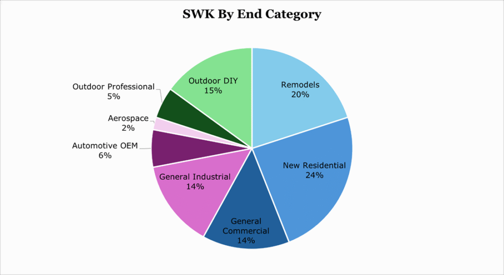 Tools and Outdoor represents 86.6% of revenues and includes all of SWK’s brands and hand tools. Most sales are linked to residential or commercial construction activity, with 63% of revenues coming from the US.