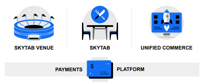 SkyTab is the brand name for the primary offering of Shift4’s business, an end-to-end payments and POS (point-of-sale) provider targeting events, hospitality, and restaurants. SkyTab includes both end-to-end payment processing as well as POS systems, business management tools, analytics, and marketing tools.