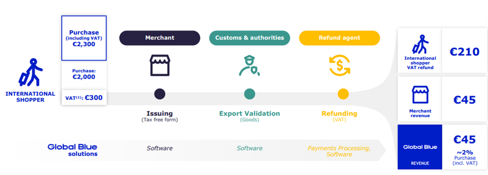 Global Blue holds a 70% market share in VAT refunds in Europe, with customers concentrated in luxury retail including LVMH and Burberry with an average customer relationship of over 20 years.