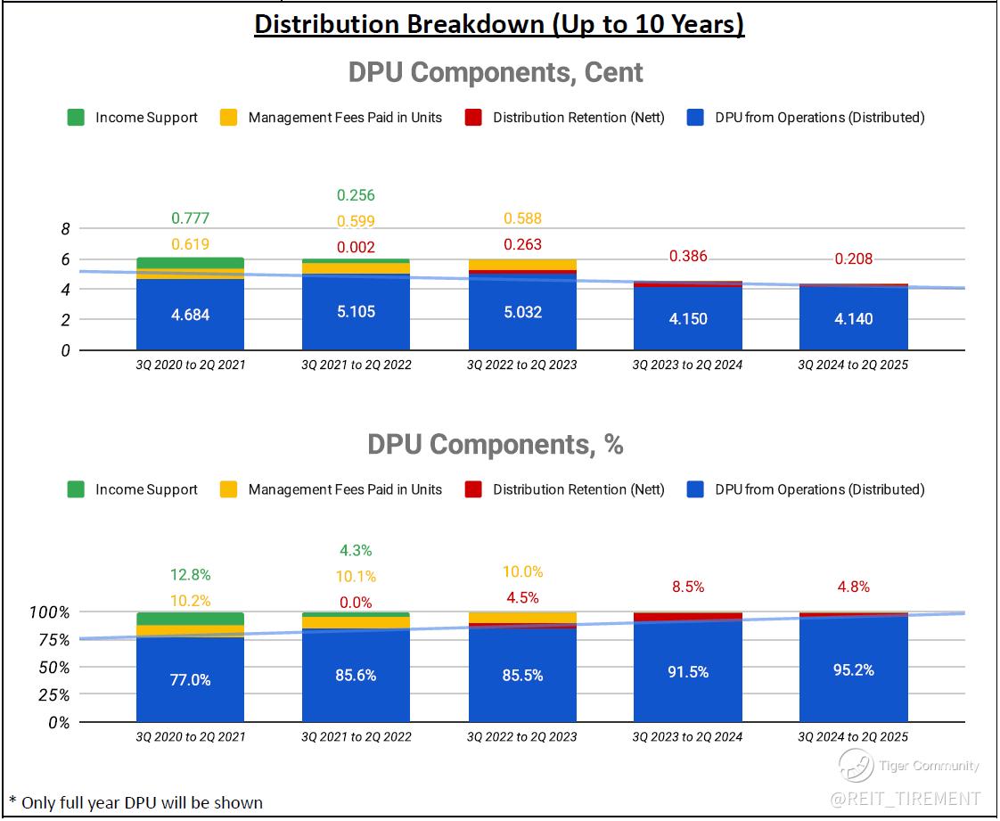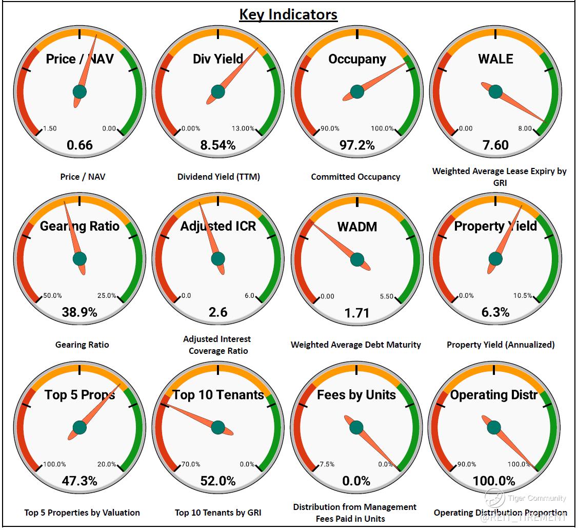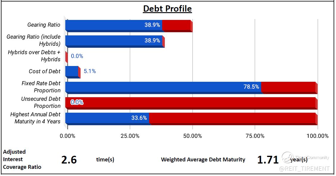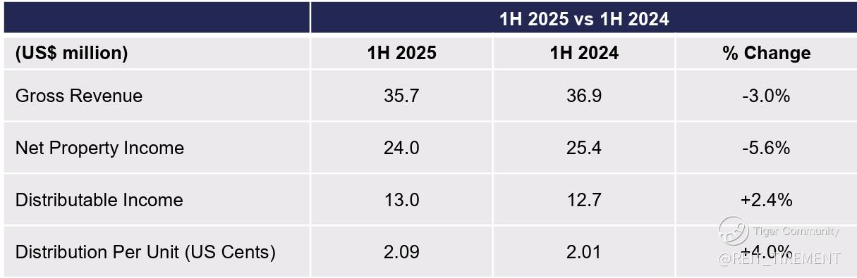 Compared to the previous half-year, gross revenue and NPI declined due to divestments, but DPU and distributable income improved on the back of lower financing costs, higher finance income and reduced retention. On the debt front, around 17% of debt matures in December 2025.