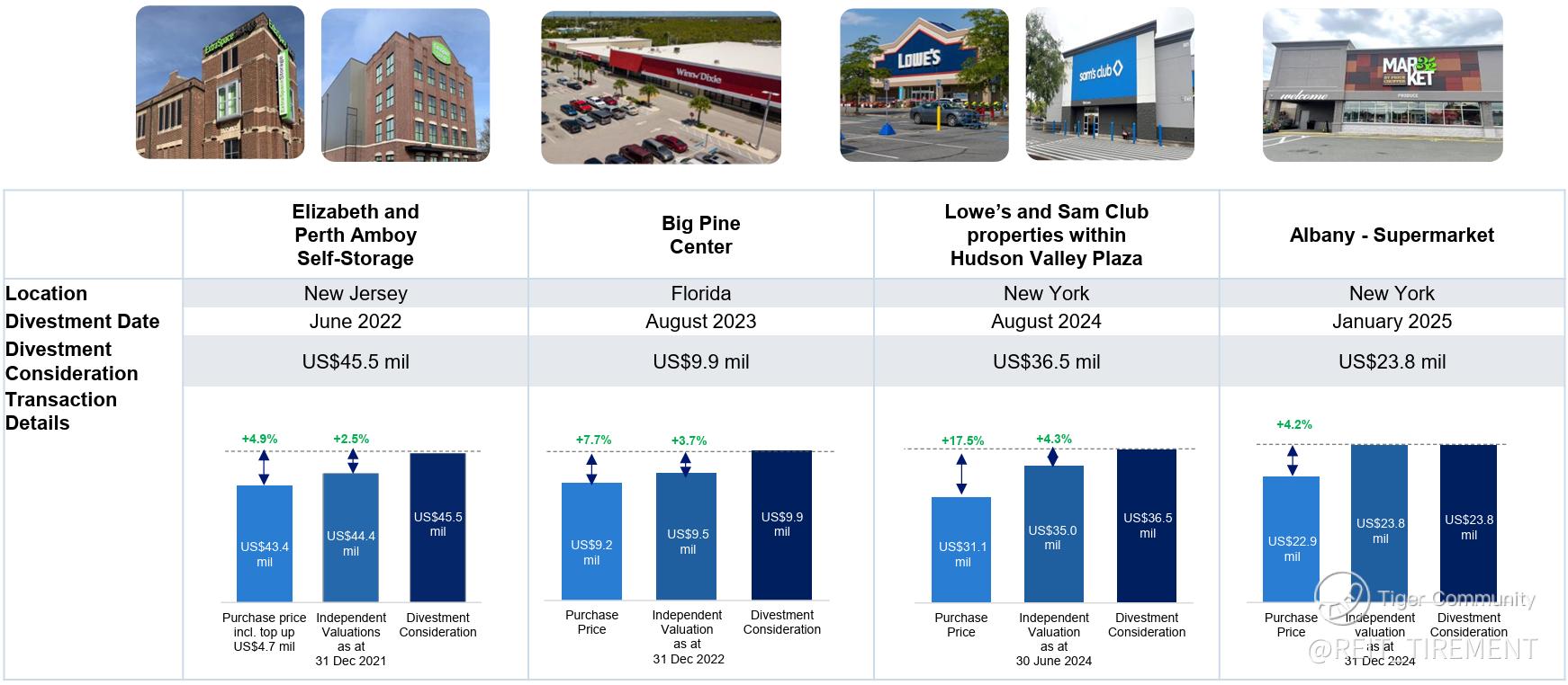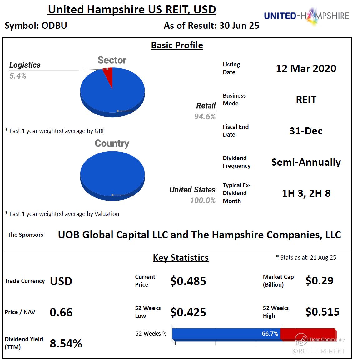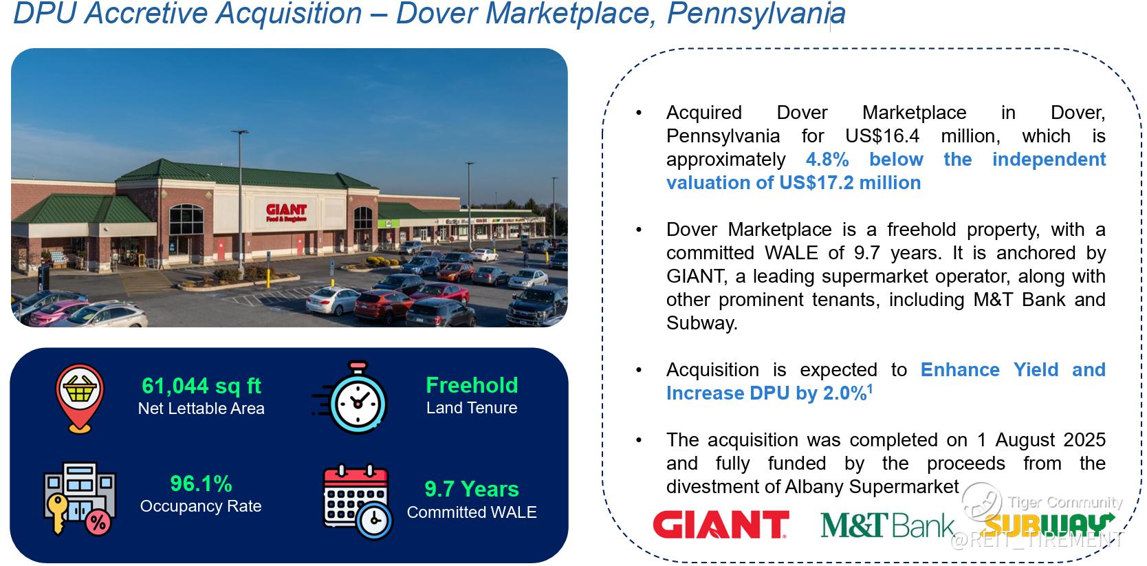 On 1 August 2025, UHREIT completed the acquisition of Dover Marketplace in Pennsylvania for US$16.4 million, approximately 4.8% below independent valuation. The purchase was fully funded using proceeds from the divestment of Albany Supermarket.