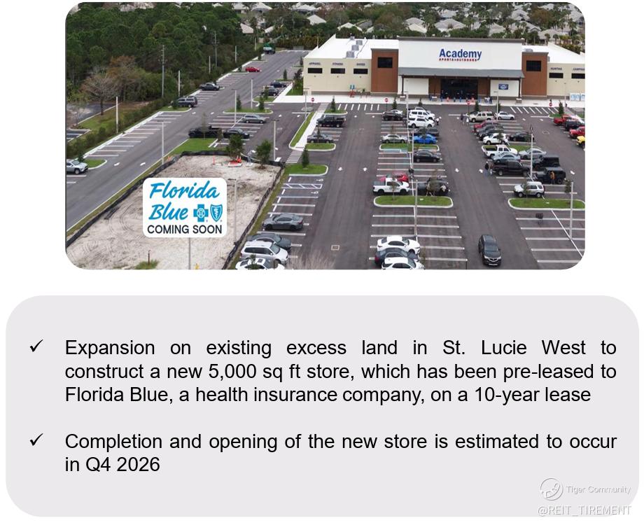 UHREIT plans to develop a new 5,000 sq ft store on excess land in St. Lucie West, pre-leased to Florida Blue on a 10-year lease. Completion is targeted for Q4 2026.