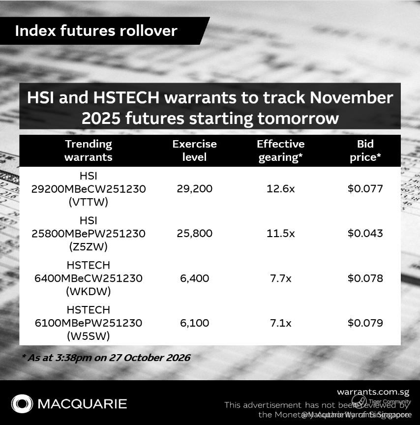 Trending HSI warrants: $HSI 29200MBeCW251230(VTTW.SI)$ and $HSI 25800MBePW251230(Z5ZW.SI)$
