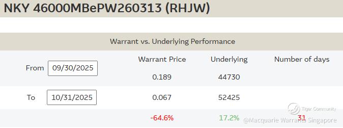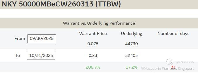 ✳✴Today's move brings the Nikkei225's total gains this month to 17.2%, while trending Nikkei225 call warrant $NKY 50000MBeCW260313(TTBW.SI)$ (https://warrants.com.sg/tools/livematrix/TTBW) is up 206% to SGD 0.230 as of 110PM today, while trending Nikkei225 put warrant $NKY 46000MBePW260313(RHJW.SI)$ (https://warrants.com.sg/tools/livematrix/RHJW) is down 63.2% to SGD 0.067 over the same period