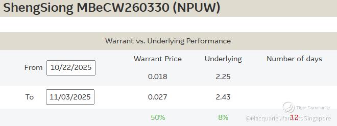 🔍Trending Sheng Siong call NPUW is up 50% from SGD 0.018 on 22 October to this morning's SGD 0.027, given Sheng Siong's 8% increase from $2.25 to $2.43 (as of 930AM)