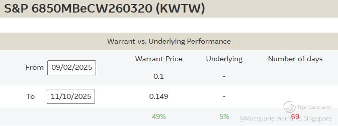 ✳Since its listing date on 2 September, trending S&P call warrant $S&P 6850MBeCW260320(KWTW.SI)$ (https://www.warrants.com.sg/tools/HistoricalPerformance/KWTW) has risen 49% to SGD 0.149, , almost ten times more than the S&P index's 5% climb over the same period.