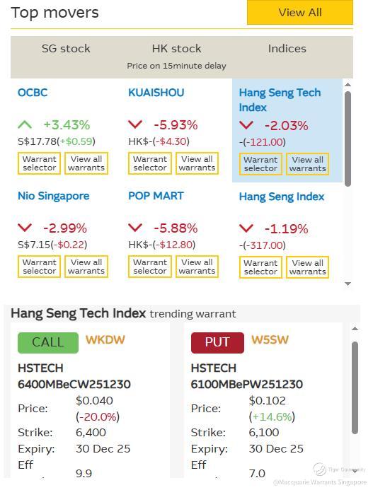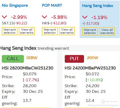 ✳✴Trending HSI and HSTECH put warrants $HSTECH 6100MBePW251230(W5SW.SI)$ (https://warrants.com.sg/tools/livematrix/W5SW) and $HSI 24200MBePW251230(JKKW.SI)$ (https://warrants.com.sg/tools/livematrix/JKKW) gained between 11% to 15% while trending call warrants $HSTECH 6400MBeCW251230(WKDW.SI)$ (https://warrants.com.sg/tools/livematrix/WKDW) and $HSI 28200MBeCW251230(IXBW.SI)$ (https://warrants.com.sg/tools/livematrix/IXBW) lost 20% and 18% respectively