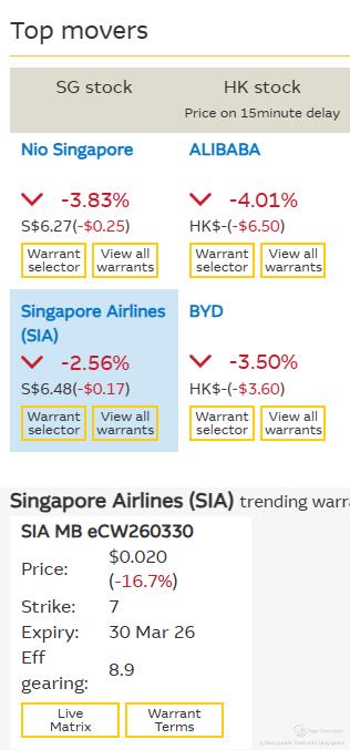 ✳Trending SIA call warrant $SIA MB eCW260330(TFGW.SI)$ (https://warrants.com.sg/tools/livematrix/TFGW) is trading down 16.7% to SGD 0.020 this morning. There are no put warrants available over SIA