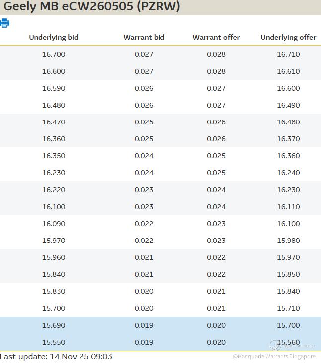 🆕Geely: call warrant $Geely MB eCW260505(PZRW.SI)$ (https://warrants.com.sg/tools/livematrix/PZRW) is newly listed this morning, enabling investors to trade any volatility in Geely's share price move ahead of or on the back of its earnings announcement next Monday.