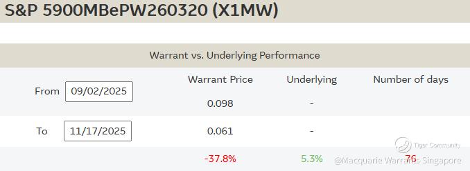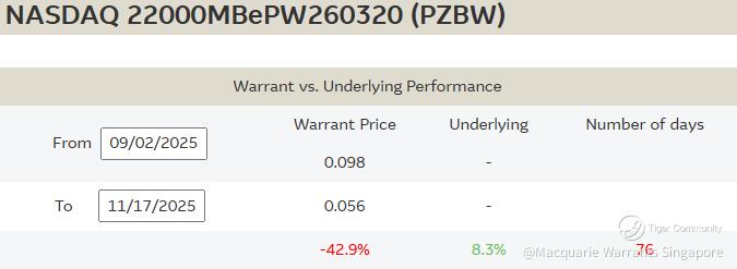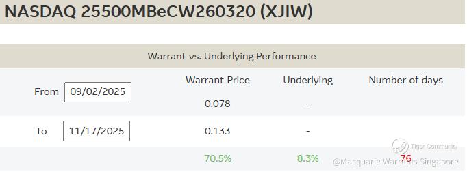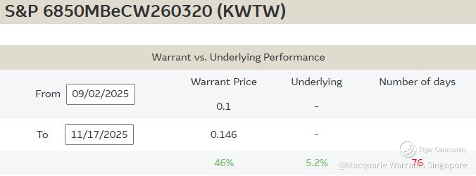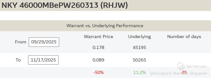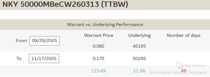 ✳Call warrant $NKY 50000MBeCW260313(TTBW.SI)$ (https://warrants.com.sg/tools/HistoricalPerformance/TTBW) has spiked 113.4% since its listing date on 29 September to SGD 0.175 as of 938AM, 10 times more than the Nikkei225's 11.3% rise over the same period.