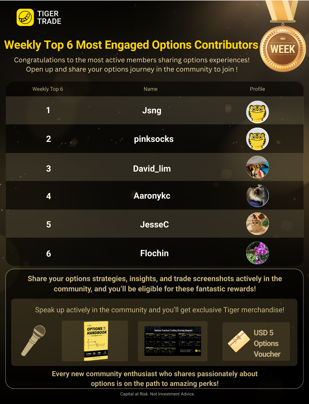 Let’s give a big round of applause to our winners! @Jsng, @pinksocks and @Aaronykc have each earned an options handbook. @David_lim and @JesseC both take home an options mouse pad, and @Flochin wins a USD 5 options voucher. Keep sharing your options insights to join this winning circle!