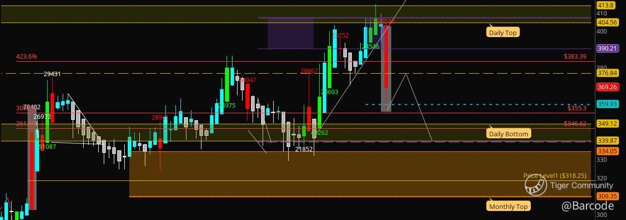 Iβm anchored to the daily chart first. The highlighted earnings candle from this week is almost identical in length to the September flush candle. Same magnitude, same emotional signature, same resolution zone. Both moves drive directly into the rising trendline, the key Fibonacci support at $355.50, and a well-defined volume shelf that previously acted as acceptance during consolidation. That symmetry matters. Markets remember stress. Downside risk remains technically open toward $349, which aligns with the next liquidity pocket and demand shelf, but the reaction into the volume shelf suggests selling pressure is slowing rather than accelerating.