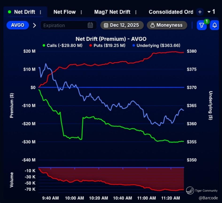 What reinforces this inflection is how aggressively positioning flipped into the flush. Friday marked $AVGO as the most unusually traded name on the tape, with over $29M in single-leg calls sold and $19M in puts purchased. That is active volatility expression, not passive hedging. Price responded accordingly, closing at $359.93, down -11.43% or more than $43 in a single session. Gamma was reset, weak hands were cleared, and price was driven directly into long-term structure.
