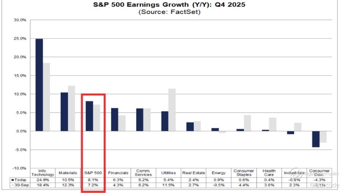 FactSet data shows Q4 earnings growth expectations pushed up to 8.1%, up 0.4% in just two weeks and 0.9% since 30Sep. That matters. Historically, estimates fall heading into earnings season. This cycle is doing the opposite. This is now the second consecutive quarter of upward revisions and the first time since 2021 we’ve seen back-to-back increases before reports begin.