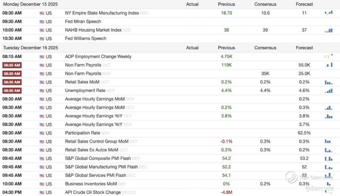 I’m watching this week as a macro cascade, not isolated events. Monday opens with the NY Empire State Manufacturing Index, which printed 18.7 versus 11 expected, the strongest reading in over a year. That flip from contraction to expansion matters because it signals supply chain pressures easing faster than consensus admits. The NAHB Housing Market Index remains subdued at 38, but the stabilisation is important as mortgage rates soften and builder confidence edges off multi-year lows. Fed speakers Miran and Williams frame the policy tone early, which matters because markets remain hypersensitive to language around inflation persistence and labour market slack.