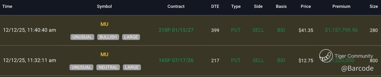 What really turns heads is the flow. I’m seeing large, unusual put selling at scale. On 12Dec, traders sold the 210P expiring Jan 2027 for roughly $41.35, collecting over $1.15M in premium. That’s long-dated, deep-strike downside being monetised. The same session saw selling of the 165P Jul 2026 for about $12.75, another $1.02M collected. This is not fear. This is conviction that downside is limited well below current levels.