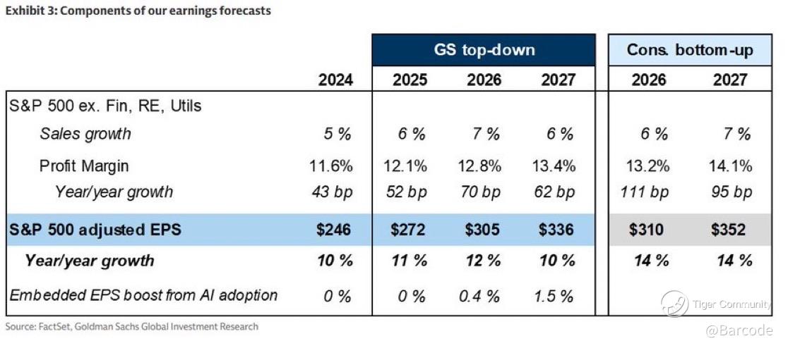 Goldman’s framework adds discipline. Their top-down model projects S&P 500 adjusted EPS at $246 in 2024, $272 in 2025, $305 in 2026, and $336 in 2027. Revenue growth averages 6% annually through 2027, with margins expanding from roughly 11.6% to 13.4%. Importantly, Goldman remains more conservative than bottom-up consensus on margin expansion, yet still embeds an AI-driven EPS uplift of 0.4% in 2026 and 1.5% in 2027. AI is no longer a hype premium. It’s a margin lever being priced cautiously as productivity gains begin to show up in operating models.