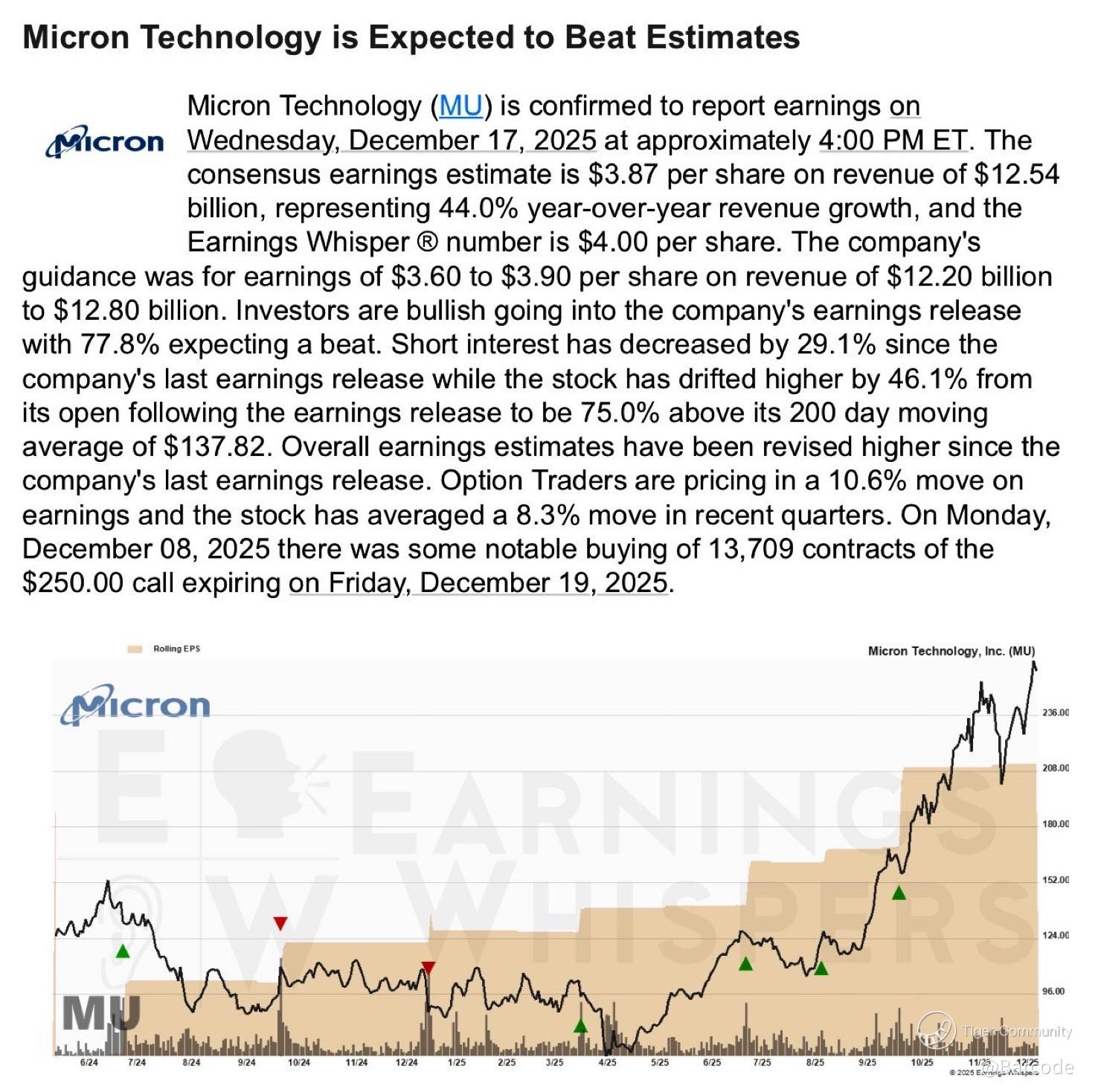 This is why Micron sits at the centre of this week for me. $MU reports earnings Wednesday, 17Dec2025 after the close. Consensus EPS stands at $3.87 on revenue of $12.54B, representing roughly 44% YoY revenue growth. The Earnings Whisper sits higher at $4.00, and 77.8% of expectations are skewed toward a beat. Since the last earnings release, estimates have been revised higher, short interest has fallen 29.1%, and the stock has drifted higher by 46.1% to trade roughly 75% above its 200-day moving average near $137.82.