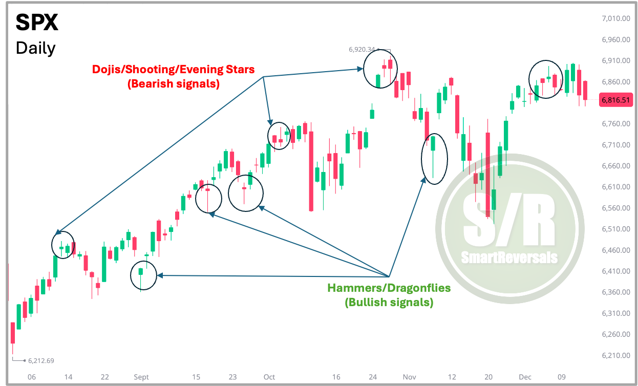 To truly understand market sentiment, you must graduate from line charts to candlesticks. A line chart smooths over the details, but candlesticks reveal the tug of war between bulls and bears in every single session. As illustrated below, patterns like the “Shooting or Doji Star” (signaling a potential drop) or the “Hammer” (signaling a potential bounce) act as early warning systems.