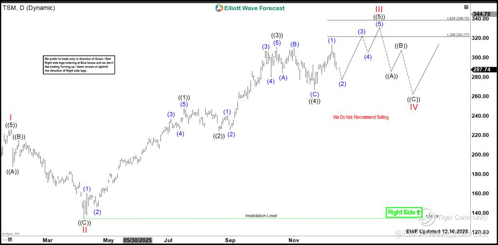 TSM daily rally began at the April 2025 low of $134. Subsequently, Wave ((1)) peaked at $248. Then, Wave ((2)) corrected to $223. After that, Wave ((3)) surged to $311. Next, Wave ((4)) found support at $266. Finally, Wave ((5)) propelled prices to new all-time highs. Therefore, this five-wave sequence is now showing enough number of swings to be called completed.