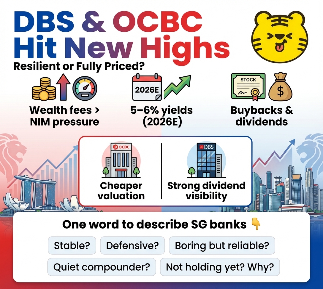 Quiet compounder. Holding both DBS and OCBC has been a steady and reassuring experience for me. Seeing them hit fresh intraday highs reinforces why I like Singapore banks as core positions — strong wealth-management income, disciplined capital returns, and clear dividend visibility make them feel dependable even as the rate cycle turns.