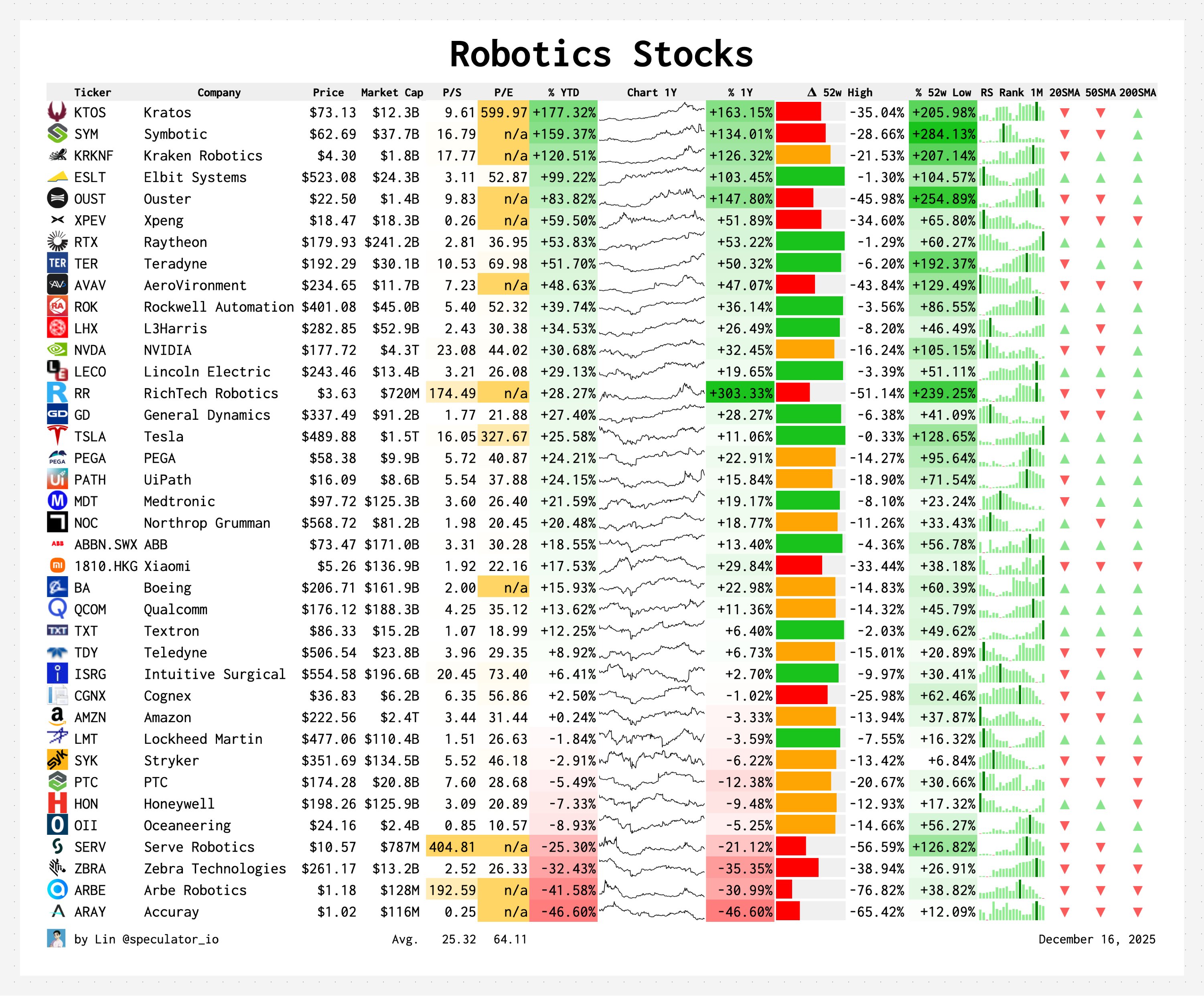 Defense Robotics: $AeroVironment(AVAV)$ $Kratos Defense & Security Solutions(KTOS)$ $Lockheed Martin(LMT)$ $Northrop Grumman(NOC)$ $Boeing(BA)$ $General Dynamics Corp(GD)$