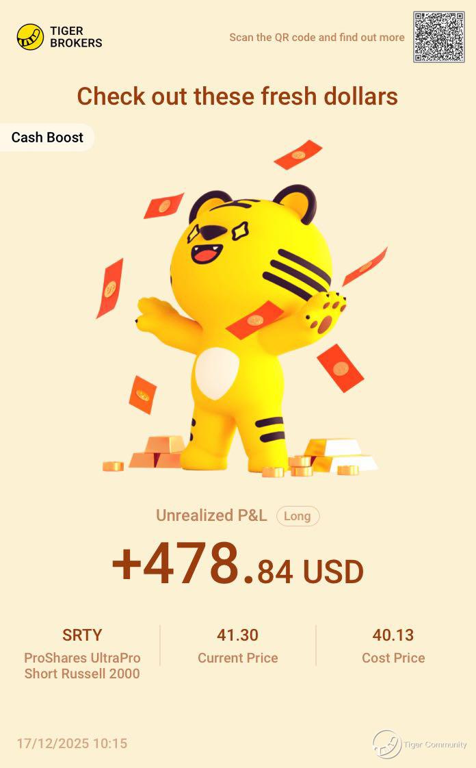 $ProShares UltraPro Short Russell 2000(SRTY)$ The "potential stocks" in holdings didn’t let me down—making a small profit feels great!