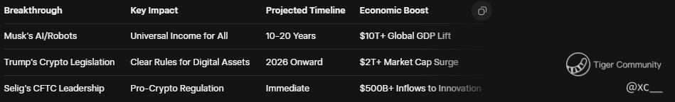 These breakthroughs interconnect like a perfect puzzle: Musk's AI-robots promise universal income, Trump's crypto laws build the financial rails, and Selig's CFTC role ensures safe innovation. Together, they paint a future of abundance β sustainable earnings from tech, secure digital wealth, and policies that empower all. By 2030, AI could eliminate scarcity, crypto democratizes finance, and regulators keep it steady. Economic inequality? Crushed. Poverty? History. This trio's synergy could generate trillions in value, from robot-powered jobs to blockchain economies. Buckle up β the ride to prosperity just accelerated! ππͺ