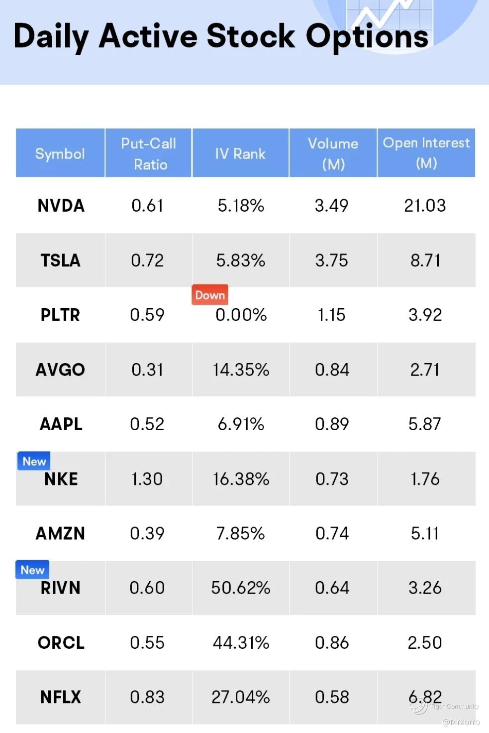 $Nike(NKE)$ entered the actives as a new addition with a put/call ratio of 1.3 and a IV rank of 16.38%, reflecting downside caution as volume hit 0.73 million contracts against 1.76 million in open interest. Shares dropped 10% after the sports giant delivered Q2 results with net profit slide and weakness of sale in China.