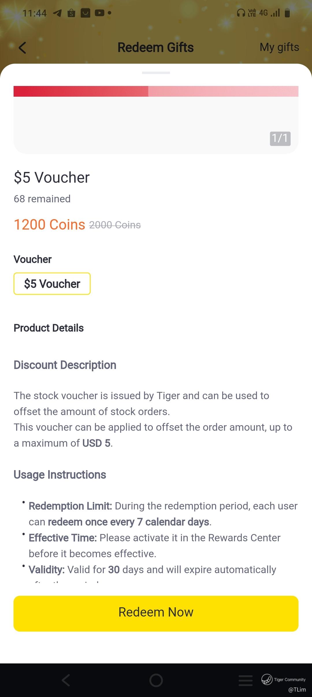 I just redeem a USD5 voucher using coins today. It is only after redemption and going into the voucher detail there is a mention of minimum order amount of USD50 requirement. There isn't such a requirement for USD10 voucher last I used. Those who are thinking of redeeming the USD5 voucher take note. Tiger should have been more upfront about this requirement. Already feedback to them but not sure they will do anything about it. It's like playing a game without knowing the rules in advance.