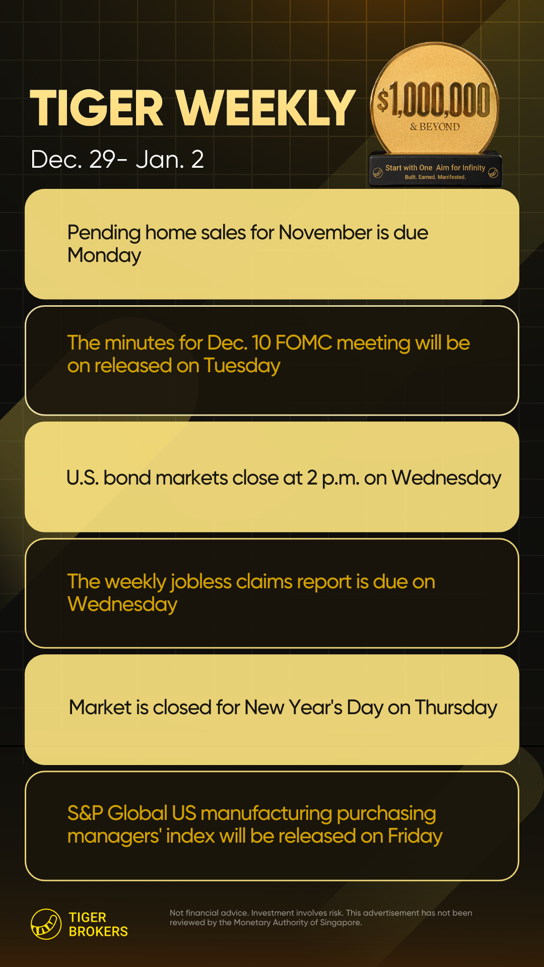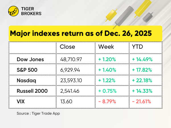 Driven by robust economic data and positive investor sentiment last week. The $Dow Jones(.DJI)$ rose by approximately 1.2%, closing at 48,710.97; $S&P 500(.SPX)$ surged by about 1.4%, closing at a new record high of 6,929.94. The $NASDAQ(.IXIC)$ increased by around 1.2%, ending the week at 23,593.096.