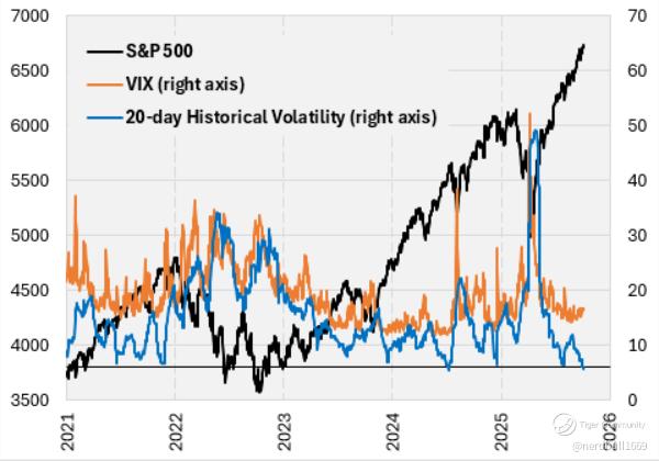 The 20-day historical volatility (HV) has fallen below 6% for the first time in over a year in 2025, meaning the index has been especially calm over the past 20 trading days as the index continues to hit new all-time highs. The second volatility measure, the CBOE Volatility Index (VIX), reflects the expected volatility over the next 30 days based on SPX option prices.