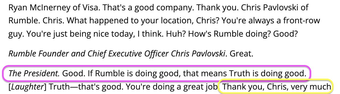 Also. President Trump has a relationship with RUM's CEO. Just this summer, the President publicly asked how Rumble was doing.