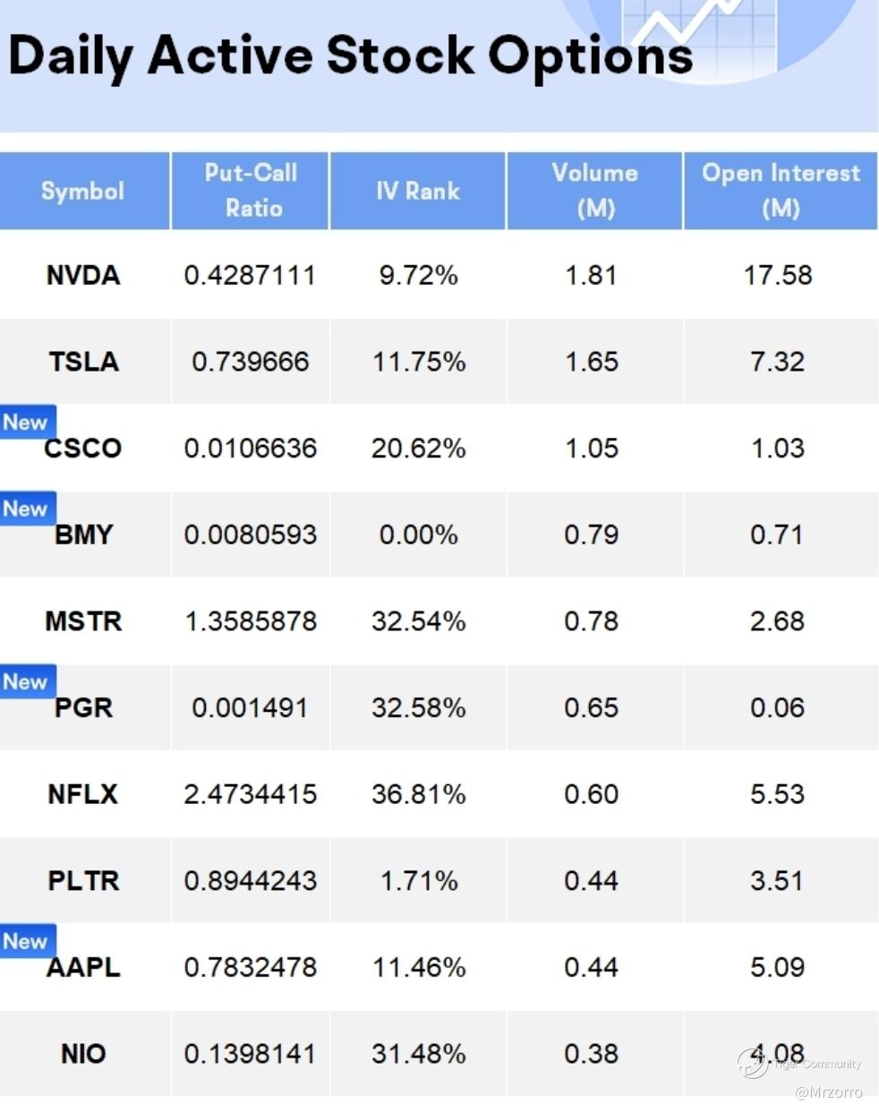 $NVIDIA(NVDA)$ topped the daily active options list with a bullish put/call ratio of 0.43 and a low IV rank of 9.72%, indicating moderate volatility expectations as volume reached 1.81 million contracts against 17.58 million in open interest. Shares declined amid concerns over intensifying competition from rival chip makers, though the prospect of resumed sales to China could signal future upside for the stock. Despite the recent dip, NVIDIA maintaining its position as a semiconductor leader.