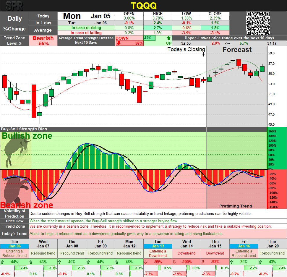 TQQQ remains positioned within a Bearish trend zone despite a short-term rebound on January 5. The long-term strategy continues to favor Sell and Observe, while short-term dynamics suggest neutral positioning with tactical selling into strength. High correlation with the US stock market and asymmetric downside intensity reinforce the need for cautious execution, disciplined risk control, and confirmation-based re-entry rather than anticipatory buying.