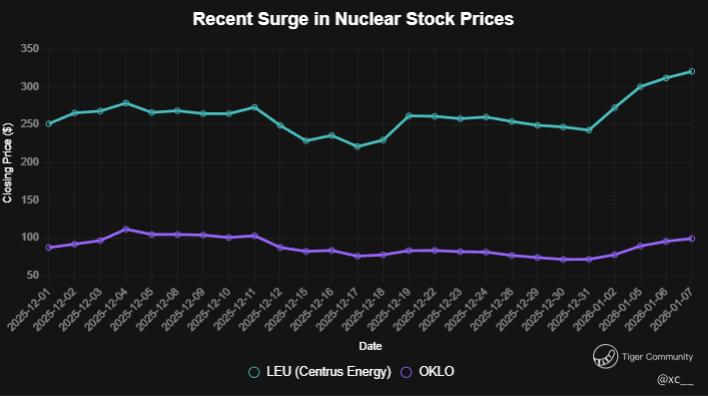 Diving into numbers: As of January 8, 2026, LEU closed at $320.61, up from $251.36 a month ago â that's a sizzling 27% gain! OKLO hit $99.18, climbing 13% in the same stretch, with even bigger daily pops tied to the grants. For context, the broader nuclear index lifted 8% this week alone, but these frontrunners are outpacing it big time.