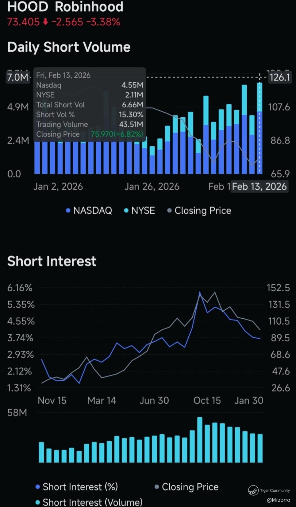 Short volume on Robinhood climbed to 6.6 million shares Friday, from 4.28 million shares after analysts cut their average price target on the stock to $129 from $144 before the company reported fourth quarter results.