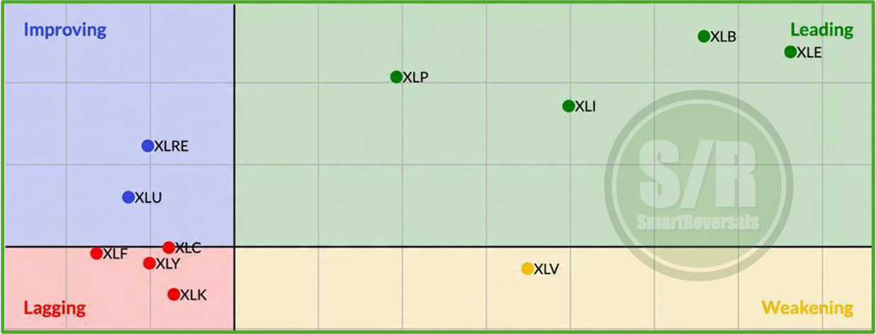 Each sector is in one of four quadrants. Currently, $Consumer Staples Select Sector SPDR Fund(XLP)$ $Industrial Select Sector SPDR Fund(XLI)$ $Materials Select Sector SPDR Fund(XLB)$ $Energy Select Sector SPDR Fund(XLE)$ are Leading.