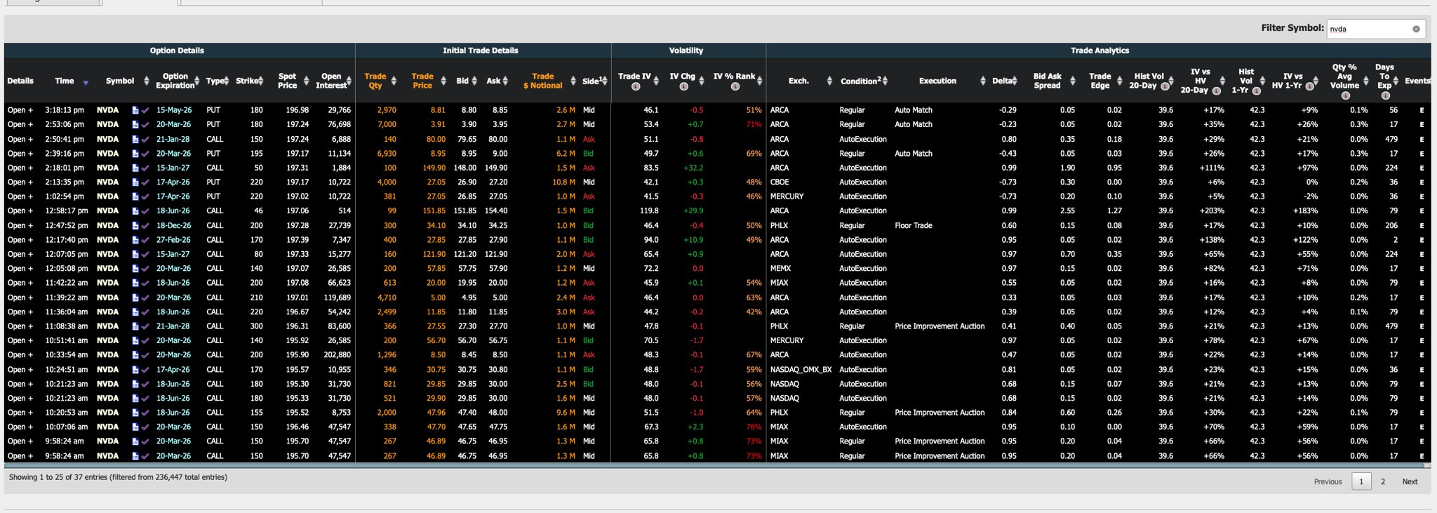 Options activity around NVDA shows multiple large block trades concentrated in March and June expirations, alongside structured positioning in longer-dated 2027–2028 contracts. The overall pattern suggests short- and medium-term directional positioning, supplemented by long-dated high-delta leverage structures.