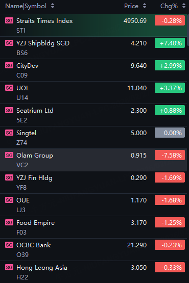 Singapore stocks opened lower on Friday. STI down 0.3%; Yangzijiang Shipbuilding up 7%; UOL up 3%; Olam down 8%.