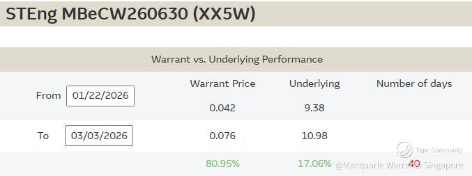 🔥 The call warrant mentioned in the article $STEng MBeCW260630(XX5W.SI)$ (https://warrants.com.sg/tools/livematrix) jumped 83% to $0.077 as ST Engineering shares traded at $11 today. XX5W which is trading 35.7% higher to $0.076 as of 1125AM, is seeing holders exit their positions in this warrant.