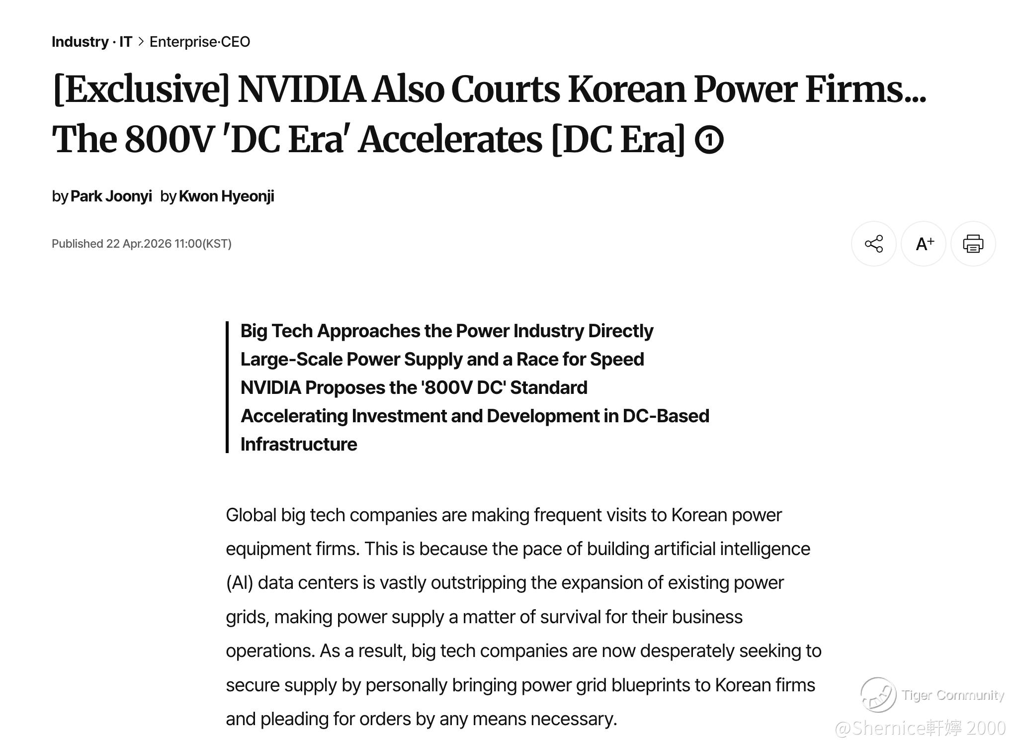 Recent reports show NVIDIA actively courting Korean power equipment firms, pushing for faster deployment of next-gen 800V DC infrastructure to support AI data centers.